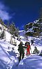 La zona del Palù sopra Chiesa Val Malenco, oltre ad essere un'area paesaggisticamente assai gradevole, con fitti boschi d'abete, un bel lago alpino ecc. è anche una delle sky aree più attrezzate e conseguentemente anche più affollate della valle del Mallero; gli impianti ivi presenti permettono di accorciare il dislivello di questa gita, aumentando il numero di coloro che possono raggiungere questa cima da cui si può godere un panorama eccezionale. Ci si trova qui infatti proprio al centro del comprensorio di cime della val Malenco, in una posizione strategica con a sud-ovest la cima del Disgrazia e a nord-est il Gruppo del Bernina. Scendendo poi con gli sci verso il lago Palù si ha proprio di fronte il ghiacciaio Canciano-Scalino con la caratteristica cima triangolare del Pizzo Scalino che domina la valle sottostante. Salita: Si può salire partendo dalla località Barchi appena sopra S.Giuseppe o accorciare il percorso partendo dall'alpe Campolungo raggiungibile con gli impianti di risalita; nel primo caso si passa vicino al bellissimo lago Palù, generalmente gelato ed al rifugio che è aperto anche d'inverno e attraversando fitti boschi di abete, ancora più belli se coperti da una bella nevicata, ci si dirige verso il Bocchel del Torno (m.2203), stretta bocchetta (attenzione se è troppo carica di neve) che permette di salire sul crinale che dà sulla val di Scerscen e da cui inizia il secondo tratto che porta alla cima del Sasso Nero; qui si incontra l'itinerario alternativo che proviene da Campolungo, da cui si è partiti appena 100 metri sotto, dopo la discesa dal Sassoalto, raggiunto tramite gli impianti. Si procede sempre diritti, poi verso sinistra e ancora a destra per portarsi in una valletta abbastanza ripida, salita la quale si raggiunge una stretta sella a quota m.2517. Da qui ci si porta verso sinistra e percorrendo un ampio vallone si raggiungono i m.2800. Si deve scendere di alcuni metri da quella che sembra essere la cima per poi risalire l'ultimo tratto verso la vetta vera e propria a m.2900. Discesa: Dal percorso di salita. Si può poi scegliere se risalire con gli impianti di Campolungo, godendo così anche di un po' di sci di pista o ridiscendere (con attenzione) per la via del Bocchel del Torno al lago Palù e quindi ai Barchi. |