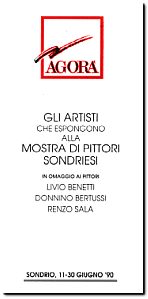 AGORA' MOSTRA DI PITTORI SONDRIESI Sondrio 11-30 Giugno 1990 ...la collettiva dei Pittori Sondriesi dedicata a Benetti, Bertussi e Sala, decreta anche l'attivitā di "Agorā". Lo spirito con cui "Agorā" nasce, č proprio quello di essere disponibile per tutti, di tentare quasi un censimento di tutti coloro che, nel campo artistico, artigianale e commerciale, abbiano voglia di dividere e condividere esperienze, confrontandosi in uno spazio neutro, nato appositamente per questo. |